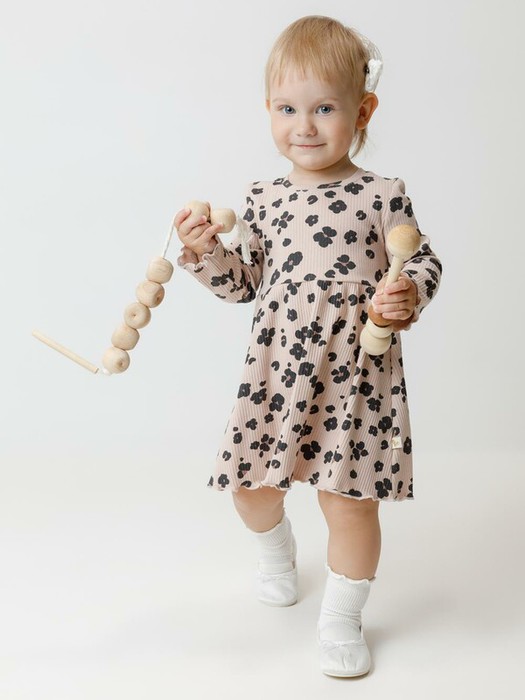 Платье для девочки из эластичного трикотажа в рубчик. Оригинальный рисунок выполнен из стойких текстильных гипоаллергенных красителей. Изделие сохраняет цвет и форму после многократных стирок. Все трикотажные полотна производятся в соответствии с нормами швейцарского сертификата ЭкоТекс.