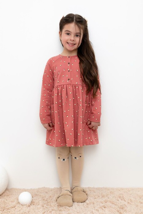 Платье с длинными рукавами из петельчатого футера. Оригинальная набивка выполнена из стойких гипоаллергенных текстильных красителей. Изделие сохраняет цвет и форму после многократных стирок. Застёжка спереди на планку с пуговицами.