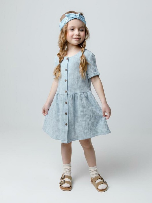 Легкое платье для девочки из мягкого хлопокового муслина со спущенной линией талии, сборкой и застежкой на пуговицы. Изделие сохраняет цвет, форму и фактуру жатости после многократных стирок.