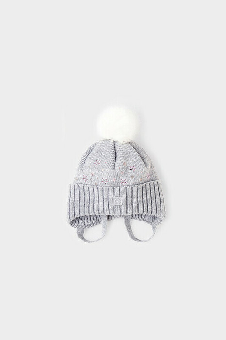 Шапка на широких завязках с высоким отворотом и мягким подкладом из интерлока. Спереди украшена стразами. На отвороте прикреплён светоотражатель, который обеспечивает дополнительную безопасность в тёмное время суток. На макушке - меховой помпон.