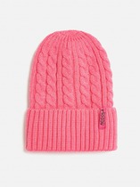Однотонная розовая шапка с отворотом из полушерсти. Украшена нашивкой с изображением единорожки.