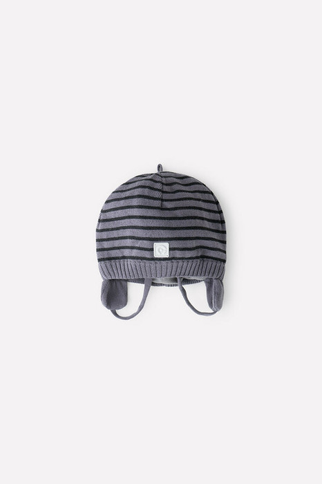 Шапка из хлопковой пряжи на завязках с мягким трикотажным подкладом из интерлока. На передней части шапочки пришит светоотражатель. Украшена вывязанным узором в полоску.