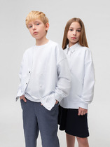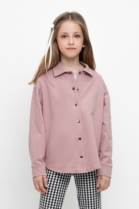 Свободная трикотажная рубашка для девочки из петельчатого футера на кнопках. Модель с закругленным низом и спущенным плечом.