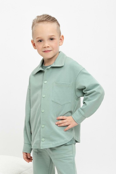 Свободная трикотажная рубашка для мальчика  из петельчатого футера на кнопках.  Модель с закгруленным низом и спущенным плечом.
