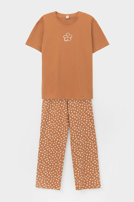 Трикотажный пижамный комплект из натурального хлопка. У футболки короткие рукава со спущенными плечами. Брюки с удобным поясом на резинке. Оригинальная набивка и принт выполнены из стойких, гипоаллергенных текстильных красителей. Все трикотажные полотна производятся в соответствии с нормами Швейцарского сертификата ЭкоТекс.