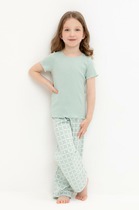 Трикотажный пижамный комплект из натурального хлопка. У джемпера длинные втачные рукава. Брюки с удобным поясом на резинке и утягивающим плетеным шнуром. Оригинальная набивка выполнена из стойких, гипоаллергенных текстильных красителей. Все трикотажные полотна производятся в соответствии с нормами Швейцарского сертификата ЭкоТекс.