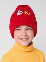 Тёплая вязаная шапка красного цвета для мальчика. На отвороте прикреплена нашивка с надписью и оригинальным рисунком.