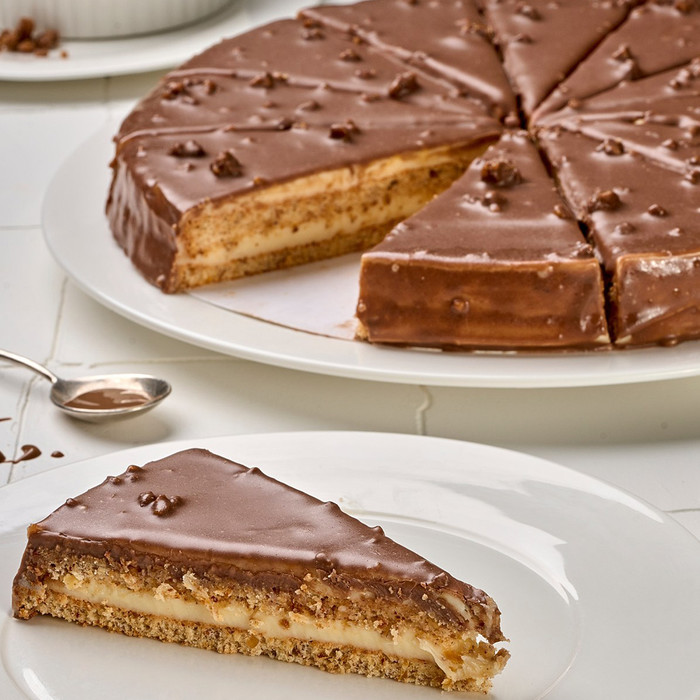 Бисквит на основе миндаля, прослоенный нежным сливочным кремом, с хрустящей карамелью, декорированный молочным шоколадом.
