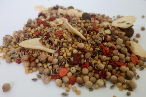 Зерно кориандра, семя укропа, перец душистый, чеснок (хлопья), лавровый лист, хлопья паприки, перец чили (хлопья), семя горчицы