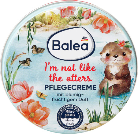 Крем-уход Balea Im not Like the Otter не только дарит коже идеальный уход, но и цветочно-фруктовый аромат. Уход подходит для лица, тела или губ. Рецепт без микропластика и водорастворимых, чисто синтетических полимеров.