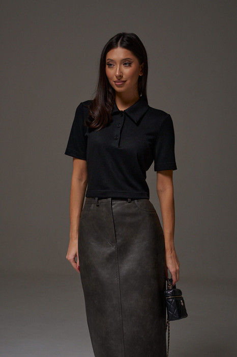 Джемпер-поло прямого кроя. Выполнен из трикотажа черного цвета. Воротник отложной. Застёжка пуговички на планке. Рукав втачной, короткий. Длина спинки 45 см. Длина рукава от линии втачивания 24 см