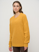 Джемпер укороченный прямого свободного кроя. Выполнен из мягкого трикотажа светло-серого цвета. Горловина-стойка, в естественную складку. Есть подплечники (съёмные). Длина рукава от линии втачивания 61 см. Длина спинки 50 см