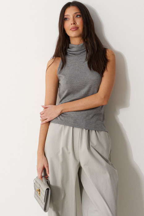 Джемпер свободного кроя. Выполнен из мягкого трикотажа серого цвета. Без подкладки. Воротник стойка. Длина спинки 54 см