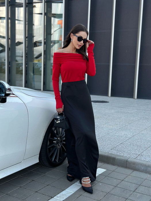 Джемпер выполнен из эластичного трикотажа средней плотности. Обработан воротником - хомкт, который можно спустить ниже плеч. Рукава прилегающего силуэта, обработаны манжнтой из основной ткани с вырезом для большого пальца.