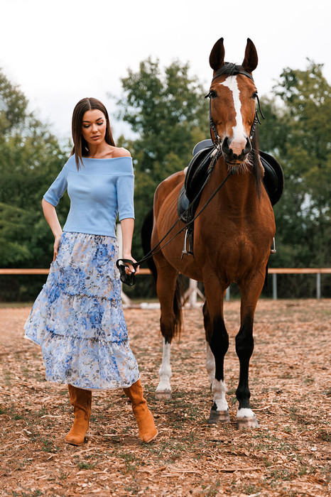 Джемпер прилегающего силуэта с открытыми плечами. По верху джемпера широкая притачная планка. Короткий рукав.