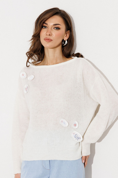 Джемпер трикотажный вязанный с втачным длинным рукавом и спущенной линией плеча. По переду и спинке нашивки. Вырез горловины круглый.