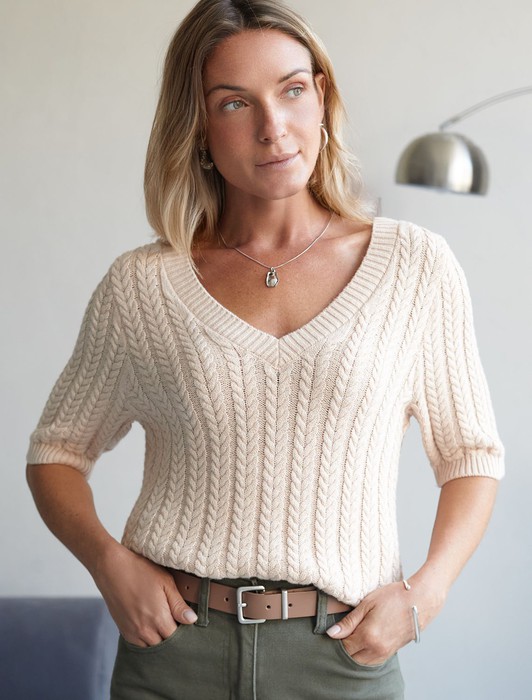 Состав: 70%Хлопок 21%ПА 9%Кашемир Плотность: 12 GG Размер товара на первом фото: 42Джемпер фактурной вязки выполнен из хлопка с добавлением кашемира. Модель с V-вырезом с вывязанным орнаментом цепи. Мягкая и очень приятная пряжа совершенно не колется, сохраняет тепло при этом не перегревая, гарантируя безупречный комфорт.