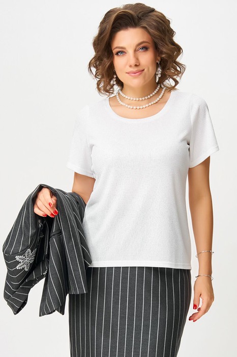 Джемпер "Веяна" — сияние мягкости. Легкая трикотажная ткань, украшенная люрексовой нитью, словно ловит свет и отражает его мягким блеском. Прямой силуэт с вытачками подчёркивает фигуру, а комфортная изнанка дарит ощущение нежности на коже. Финишные акценты — тонкая планка горловины и утончённая обработка низа — делают образ завершённым.