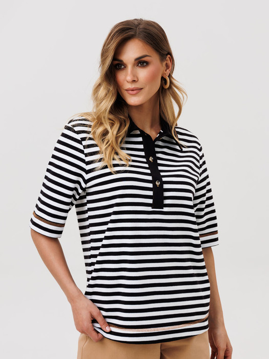 Джемпер прямого силуэта с воротником поло. Рукав втачной одношовный. По низу изделия, по низу рукава и по воротнику проложена отделочная строчка. Воротник и планка с застежкой выполнены из отделочной ткани. Длина джемпера- 66 см, длина рукава - 30 см
