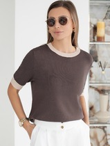 Джемпер прямого силуэта из трикотажного полотна. Перед с застежкой поло и нагрудными вытачками. По воротнику, низу изделия и низу рукава отстрочена декоративная строчка. Длина джемпера - 61 см, длина рукава - 61 см.