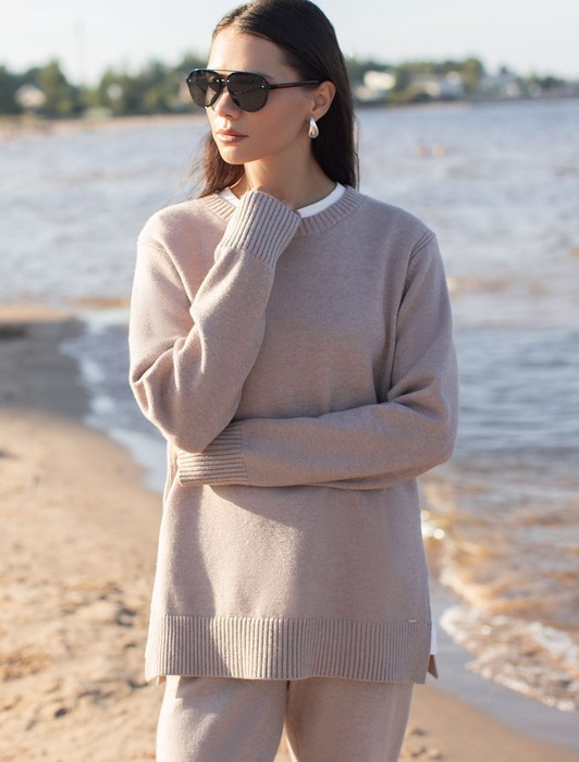 Состав: 52%ПАН (акрил) 33%ПЭ 8%ПУ 7%Кашемир Плотность: 7 GG Размер товара на первом фото: 42Джемпер с круглым воротом выполнен из мягкой меланжевой пряжи с кашемиром. Лаконичная модель свободного силуэта дополнена боковыми разрезами. Мягкая пряжа очень приятная к телу, поддержит комфорт на протяжении всего дня. Сочетается в костюме с брюками D38.013, D38.012 и юбкой D36.016