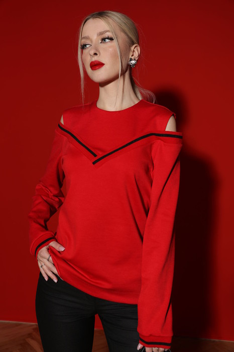 Джемпер свободного объёма, оригинального кроя, с имитацией топа и открытыми плечами. Горловина круглая, по спинке застежка на петлю и пуговицу  Отделка горловины джемпера  и манжеты  выполнены из довязов в контрастном цвете.
