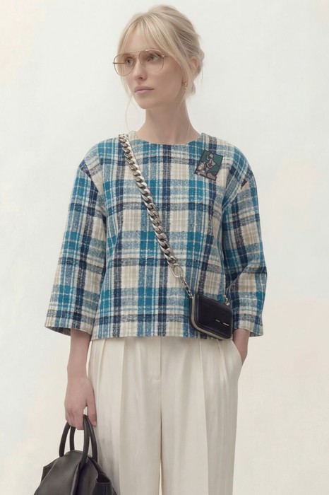 Топ выполнен из текстильной ткани дизайн клетка, на трикотажной подкладке. Линия плеча спущена, рукав укороченный 3/4. По переду округлый вырез горловины. По спинке застёжка на петли и пуговицы. В комплект входит брошь ручной работы.