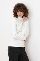 Уютный джемпер с округлой горловиной. Защипы на рукаве-реглане делают образ максимально женственным и элегантным. На рукавах есть съёмные авторские украшения в виде цветка из основной ткани.