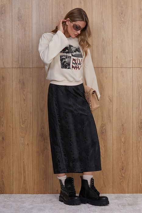 Объемный свитшот из плотного премиального трикотажного полотна. Изделие прямое. Горловина круглая с притачной планкой из отделочной ткани. Рукав спущенный, длинный, объемный. Низ рукава расширен. Низ изделия на планке из отделочной ткани. Перед и спинка изделия прямые. На передней половинке свитшота авторский принт.