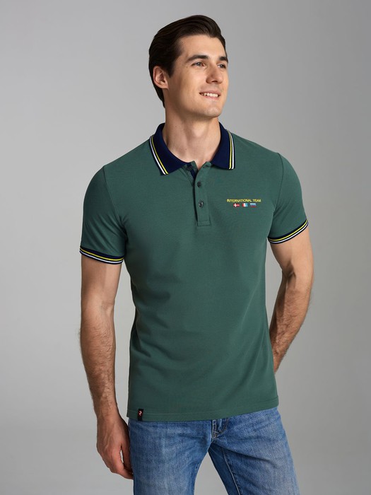 Футболка-поло из хлопкового полотна "пике". Классическая модель поло с короткими рукавами. Воротник и манжеты рукава выполнены из трикотажной рибаны темно-синего цвета с бело-желтой полосой. На полочке застежка-планка на пуговицах. На нижней планке и по горловине настрочена контрастная киперная тесьма. На полочке выполнена вышивка "INTERNATIONAL TEAM" и вышивка флагов. По низу футболки в боковых швах выполнены разрезы, обработанные тесьмой. С правой стороны полочки, по низу настрочен жаккардовый "флажок" с логотипом.