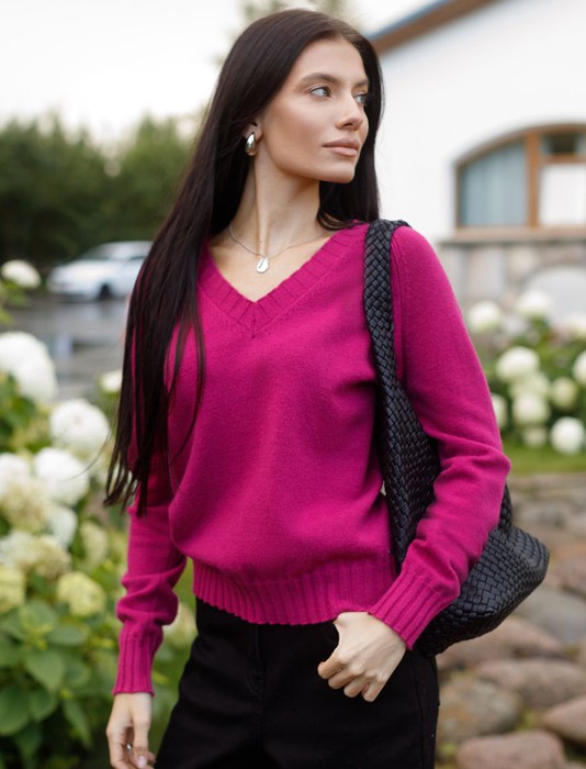 Состав: 52%ПАН (акрил) 33%ПЭ 8%ПУ 7%Кашемир Размер товара на первом фото: 42Невероятно женственный джемпер цвета фуксия с V вырезом связан из высококачественной пряжи с кашемиром — идеальное сочетание мягкости и практичности. Пряжа с кашемиром придаёт ему бархатистую нежность и тонкую структуру, каждое прикосновение с которой, напоминает о тепле и уюте в прохладные дни. Благодаря нежной текстуре материала этот вариант отлично подходит даже для чувствительной кожи, не вызывая раздражения и дискомфорта в течение дня. Сдержанный, элегантный силуэт джемпера подчёркивает вкуc обладательницы, а филигранная отделка ворота — внимание к деталям. Яркий оттенок и изящная мягкость делают его идеальным выбором в любой ситуации. Широкие манжеты и нижний край добавляют аккуратности, а продуманная посадка делает повседневный джемпер удобным для многослойных образов — от офисного комплекта, например, в сочетании с блузкой, до расслабленного уикенда. Свободный крой джемпера идеально подходит для женщин, которые ценят удобство и стиль одновременно, а так же идеально подходит на большие размеры. Благодаря качественной пряже свитер сохраняет форму и внешний вид даже после многократных носок. Практичный фасон идеально подходит для работы в офисе или встреч с друзьями. Благодаря классическому крою джемпер гармонично сочетается практически с любыми элементами гардероба, помогая всегда выглядеть актуально. Сочетается в костюме с брюками D38.013, D38.012 и юбкой D36.016