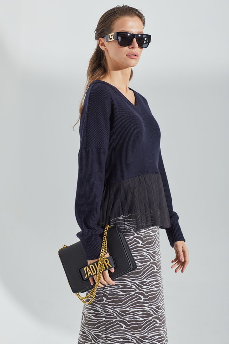 Джемпер трикотажный свободного кроя. Вырез горловины V-образный. По линии талии вставлена отделка из сетки. Рукава длинные с манжетой по низу. Длина джемпера выше линии бедер.