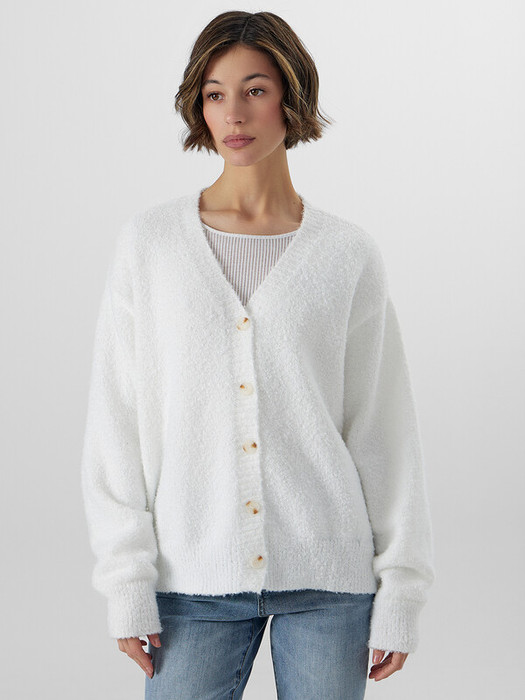 Женский кардиган молочного цвета выполнен из невероятно мягкого и уютного материала, напоминающего шерпу. Его пушистая текстура создает ощущение тепла и комфорта, делая модель идеальной для прохладных дней. Кардиган застегивается на пять пуговиц по центру, что позволяет легко регулировать плотность застегивания. Элегантный V-образный вырез горловины удлиняет силуэт и легко сочетается с разными вариантами базового гардероба.