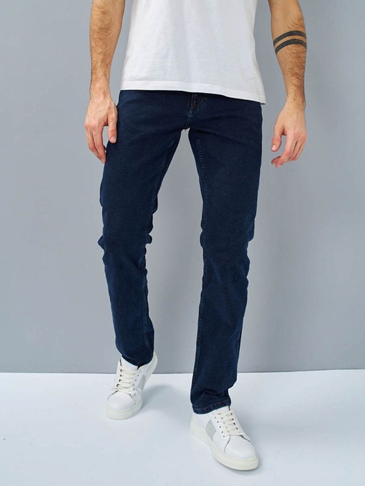 Мужские модные джинсы с пятью карманами. Посадка Slim fit (облегающие по бедру), средняя талия спереди, высокая сзади.. Застежка на молнии. Немного зауженные к низу. Боковой  шов сделан в разутюжку .  Выполнены из слабоэластичной ткани denim comfort stretch, цвет ткани Blue/Black(лицевая сторона ткани темно-синяя, изнаночная сторона- черная). Классическая темная стирка с потёртостями только по швам. Параметры указаны для размера 32. Длина внутреннего шва  - 85,5 см.