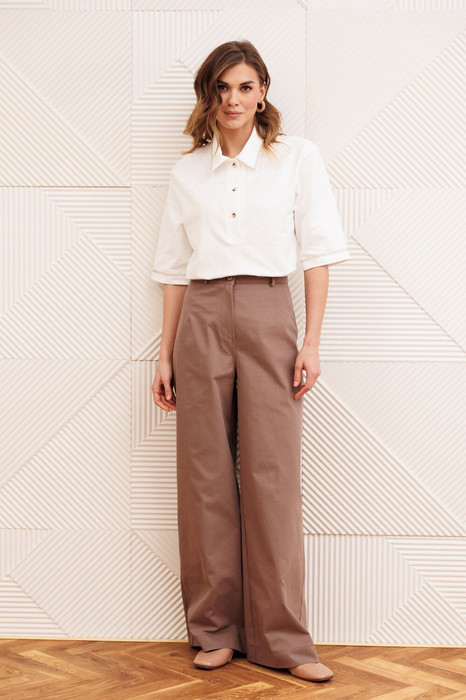 Брюки расширеные книзу на притачном поясе из джинсовой хлопковой  ткани. По поясу настрочены шлевки. По передним и задним частям брюк вытачки. На задних частях брюк настрочены карманы. Карманы, вытачки, пояс, низ брюк отделаны отделочной строчкой. Длина брюк с учетом пояса - 109 см