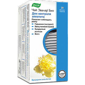 Чай Эвалар БИО для контроля аппетитаСпособствует снижению аппетита. Помогает соблюдать диету и контролировать весКак работают ингредиенты?Гарциния камбоджийская содержит гидроксилимонную кислоту, которая подавляет аппетит, замедляет превращение избыточных углеводов в жиры, повышает энергетический потенциал организма, способствует снижению уровня холестерина в крови, уменьшает ожирение печени.Листья матэ способствует выведению жидкости.Трава хвоща полевого оказывает мочегонное, противовоспалительное действие, способствует нормализации водно-солевого обмена.Листья березы благотворно влияют на обмен веществ.Кукурузные рыльца применяются для снижения концентрации глюкозы в крови, а также для подавления аппетита. Средства на основе кукурузных рылец очищают организм, выводят лишнюю жидкость. Они помогают восстановить солевой баланс и снизить уровень вредного холестерина в крови.Достоинства чаев «Эвалар БИО»    100% натуральный состав.Большинство трав, входящих в состав, собираются на Алтае или выращиваются на собственных плантациях Эвалар в экологически чистых предгорьях Алтая без использования химикатов и пестицидов;    Высокая микробиологическая  чистота чаев обеспечивается мягким способом обработки – «мгновенный пар» - на современной французской установке;    Для наилучшего сохранения целебных свойств, тонкого вкуса и аромата травяного чая каждый фильтр-пакет индивидуально упакован в многослойный защитный конверт.    Почувствуйте природную силу Алтая в травяных чаях Эвалар Био.    Чай Эвалар Био – здоровье в каждой чашке.    Гарантия чистоты и качества по стандарту GMP. Состав1 фильтр-пакет содержит     МассаЧай матэ     300 мгКукурузные рыльца     300 мгТрава хвоща полевого     280мгЛистья берёзы     200 мгЛистья земляники     108 мгЧай черный     108 мгЛистья чёрной смородины     85 мгЛистья мяты перечной     84 мгЭкстракт гарцинии     20 мгАроматизатор натуральный «Черная смородина»     15 мг2 фильтр-пакета в день обеспечивают рекомендуемую суточную норму потребления флавоноидов в пересчете на рутин (6 мг) на 20%, гидроксилимонной кислоты (12 мг) на 12%.СвойстваСпособ применения     1 фильтр-пакет (освободить из индивидуальной упаковки) залить 1 стаканом кипятка (200 мл), настоять 5–10 минут,принимать взрослым по 1 стакану 2 раза в день.Рекомендуется регулярный прием.Не рекомендуется     При индивидуальной непереносимости компонентов, беременности, кормлении грудью.Перед применением рекомендуется проконсультироваться с врачом.Документ     СоГР № RU.77.99.88.003.Е.008743.10.14 от 03.10.2014 г.Форма выпуска     Фильтр-пакетыМасса фильтр-пакета     1,5 г№     20Основные компоненты этой пищевой добавки такие – листья матэ, плоды гарцинии камбоджийской, кукурузные рыльца, трава хвоща. После сбора они проходят специальную мягкую обработку «мгновенный пар», которая сохраняет максимум полезных свойств и обеспечивает микробиологическую чистоту сырья. Травы, входящие в состав чая, способствуют:    выведению лишней жидкости;    подавлению аппетита;    поддержанию солевого баланса в норме;    замедлению превращения простых углеводов в жиры;    снижению повышенного уровня глюкозы в крови.Прием чая «Эвалар БИО» для контроля аппетита можно вести одновременно со строгими диетами. Регулярное употребление чая «Эвалар Био» для контроля а