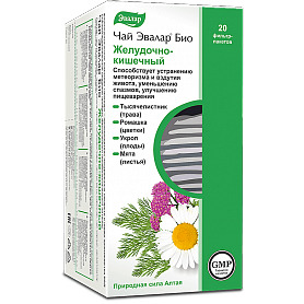 Чай Эвалар БИО желудочно-кишечныйЧай Эвалар БИО желудочно-кишечный способствует: устранению метеоризма и вздутия живота*; уменьшению спазмов*; нормализации работы желудочно-кишечного тракта*; улучшению пищеварения*; снижению риска воспаления*. В составе: ароматные цветки ромашки и листья мяты, бодрящий вкус травы тысячелистника и пряная свежесть плодов укропа.Как работают ингредиентыРомашка аптечная оказывает противовоспалительное, спазмолитическое и обезболивающее действие при спазмах брюшной полости, воспалительных заболеваниях желудочно-кишечного тракта 1,2.Плоды укропа оказывают противовоспалительное, спазмолитическое действие, улучшают функциональную активность желудочно-кишечного тракта. Отвары и настой плодов повышают секрецию желудочного сока, обладают желчегонным действием, поэтому применяются для улучшения аппетита и снижения чувства тяжести в области желудка после приема тяжелой пищи 1,3,4.Трава тысячелистника обладает спазмолитическим, противовоспалительным, антимикробным, кровоостанавливающим, обезболивающим, вяжущим действием, нормализует секреторно-моторные процессы в желудочно-кишечном тракте, возбуждает аппетит. Средства на основе тысячелистника в связи с его горьким вкусом способствуют возбуждению секреции слюнных желез, усиливают секрецию желудочного сока, желчеотделения, уменьшают метеоризм 1,4.Листья мяты содержат эфирное масло, действующее спазмолитически в отношении гладкой мускулатуры желудочно-кишечного тракта, а кроме того обладающее желчегонным, ветрогонным и антибактериальным свойством. Мята перечная представляет собой натуральное средство, прежде всего при синдроме раздраженного желудка с функционально-спастическими явлениями 2.Достоинства чаев «Эвалар БИО»: 100% натуральный состав. Большинство трав, входящих в состав, собираются на Алтае или выращиваются на собственных плантациях Эвалар в экологически чистых предгорьях Алтая без использования химикатов и пестицидов Высокая микробиологическая чистота чаев обеспечивается мягким способом обработки – «мгновенный пар» - на современной французской установке. Для наилучшего сохранения целебных свойств, тонкого вкуса и аромата травяного чая каждый фильтр-пакет индивидуально упакован в многослойный защитный конверт Произведено Эвалар по стандарту GMP – гарантия качества, чистоты и эффективности Нежный вкус и тонкий аромат алтайских трав доставит вам истинное удовольствие Состав1 фильтр-пакет содержит МассаЦветки ромашки аптечной 600мгПлоды укропа 400 мгТрава тысячелистника обыкновенного 300 мгЛистья мяты перечной 300 мгЧай черный 200мгАроматизатор натуральный «Черная смородина» 2 фильтр-пакета в день обеспечивают рекомендуемую суточную норму флавоноидов в перерасчете на рутин (16 мг) — на 53%* Информация подтверждена СоГР1. Пилат Т.Л., Иванов А.А. Биологически активные добавки к пище (теория, производство, применение). - М.: Авваллон, 2002. – 710 с. 2. Вайс Р.Ф., Финтельманн Ф. Фитотерапия. – М.: Медицина, 2004. – 552 с. 3. Чиков П.С. Лекарственные растения. – М.: Медицина, 2002. – 496 с. 4. Задорожный А.М., Кошкин А.Г., Соколов С.Я., Шретер А.И. Справочник по лекарственным растениям. – М.: Экология, 1992. – 415 с.СвойстваСпособ применения 1 фильтр-пакет (освободить из индивидуальной упаковки) залить 1 стаканом кипятка (200 мл), настоять 5-10 минут,принимать вз