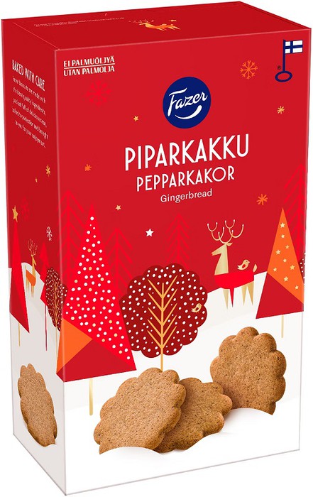 Fazer Имбирное печень 175 г Ингредиенты: Мука пшеничная, сахар, рапсовое масло, специи (кардамон, корица, гвоздика), патока, соль, разрыхлитель (Е500), эмульгатор (соевый лецитин), пшеничная клетчатка, ароматизатор. Аллергены: Содержит пшеницу, содержащие глютен зерна и продукты, соевые бобы. Пищевая ценность от 100 г Энергия 2009 кДж/482 ккал Жир 20 г из них насыщенные 1,4 г Углеводы 69 г из них сахара 30 г Белок 5,6 г Соль 1,2 г