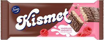 Kismet Хрустящие шоколадные вафли с малиновым йогуртом Ингредиенты: Сахар, полностью отвержденный растительный жир (кокосовый), ПШЕНИЧНАЯ мука, какао-масло, обезжиренное сухое МОЛОКО, сухая сыворотка (из МОЛОКА), какао тертое, ПШЕНИЧНЫЙ крахмал, обезжиренный йогуртовый порошок (МОЛОКО), МОЛОЧНЫЙ жир, рапсовое масло, эмульгатор (соевый лецитин), порошок малины (0,2%), соль, разрыхлитель (Е500), регулятор кислотности (Е330), ароматизаторы (например, малина). МОЖЕТ СОДЕРЖАТЬ Фундук, яйца и другие злаки, содержащие глютен. Не менее 30% какао в молочном шоколаде. Аллергены: Содержит Лактозу, Зерновые и продукты, содержащие глютен, Пшеницу, Молоко, Соевые бобы. Может содержать в небольших количествах Ячмень, Яйцо Рожь, Лесной орех, Овес, Орехи. Пищевая ценность на 100 г Энергетическая ценность 2250 кДж/538 ккал Жиры 32 г из них насыщенных 25 г Углеводы 55 г в том числе сахара 42 г Белок 6,5 г Соль 0,32 г Питательные свойства: Не содержит желатин из говядины Не содержит желатин из свинины Без консервантов