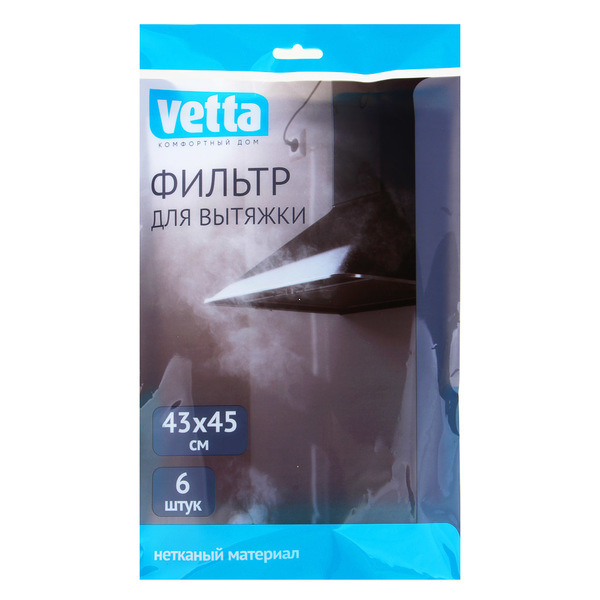 Фильтр Vetta представляет собой сетку из синтетического микроволокна. Фильтр способствует увеличению срока службы вытяжки, так как он задерживает частицы масла и жира, предотвращая образование жировых отложений на стенках прибора. Предотвращает загрязнение потолков и стен кухни. Жиропоглощающий фильтр невозможно очистить самостоятельно, поэтому по окончании срока службы он подлежит замене. Рекомендуется менять фильтр раз в 3 месяца. Если на кухне сохраняются посторонние запахи и снижается эффективность очистки воздуха, то фильтр пора заменить.