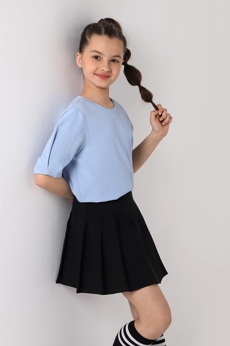 Футболка для девочек модной объемно-силуэтной формы, с вертикальным отстроченным швом по центру переда. На рукавах также выполнены декоративные вертикальные отстроченные швы и глубокие защипы по низу.