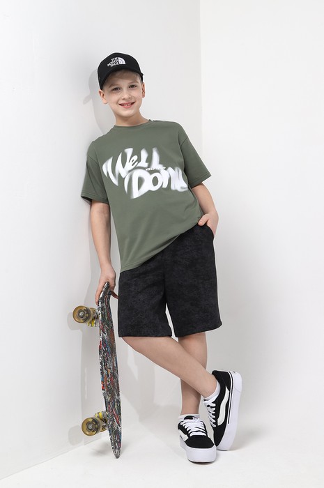 Футболка оверсайз для мальчика из трикотажного полотна: хлопкового с добавлением лайкры. Модель с принтом на переде, спущенной линией плеч, рукавами длиной до локтя.