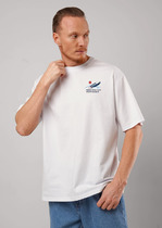Футболка мужская из гладкокрашеного трикотажного полотна "кулирка с лайкрой" классического покроя со слегка удлиненными плечевыми швами, короткими втачными рукавами, и горловиной овальной формы, обработанной втачной планкой. На детали переда - принт, выполненный в технике шелкографии. По горловине настрочена двойная отделочная строчка. Низ рукавов и изделия обработаны подгибкой.