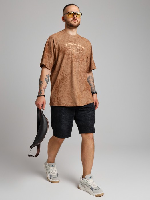 Футболка мужская из трикотажного полотна "кулирка-варенка", с короткими рукавами покроя "реглан", горловиной овальной формы, обработанной втачной планкой, и принтом в центре детали переда, выполненным в технике шелкографии. По швам реглана и горловине настрочены отделочные строчки.