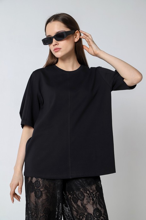 Футболка женская модной объемно-силуэтной формы, с вертикальным отстроченным швом по центру переда. На рукавах выполнены глубокие защипы по низу и также вертикальные отстроченные швы.