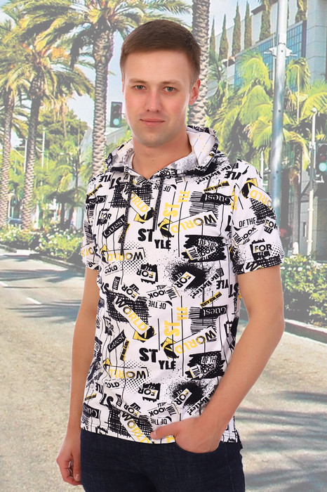 Мужская футболка с капюшоном на шнурке. Короткий рукав на манжете. Ткань в рисунок.