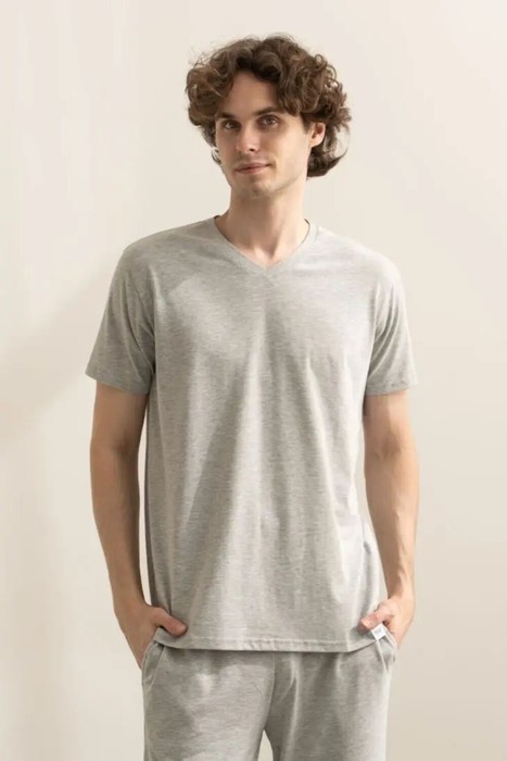 Классическая футболка с V- образным вырезом горловины и классическим рукавом из полотна в цвете серый меланж качества PENYE. Универасальная конструкция и базовый серый цвет. Футболка отлично сочетается с различными джинсами, брюками, шортами.