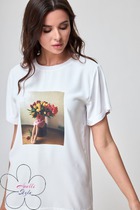 Футболка женская прямого кроя, длиной до середины бедра. Горловина округлая, обработана бейкой с актуальным эффектом "открытого среза". Рукав втачной, короткий. По переду печатный принт.