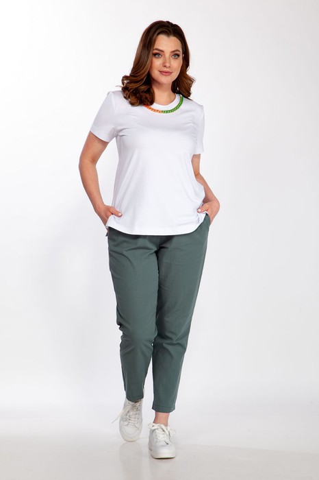 Майка женская полуприлегающего силуэта выполнена из вискозы. Горловина круглая с притачной планкой украшена съемной цепочкой, рукав втачной короткий. Длина майки- 62 см.