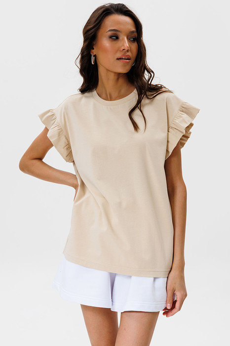 В этой футболке с воланами от GOwear вы не останетесь незамеченной! Вы легко сможете собрать много стильных образов с вашими юбками, шортами, жакетами и брюками!
